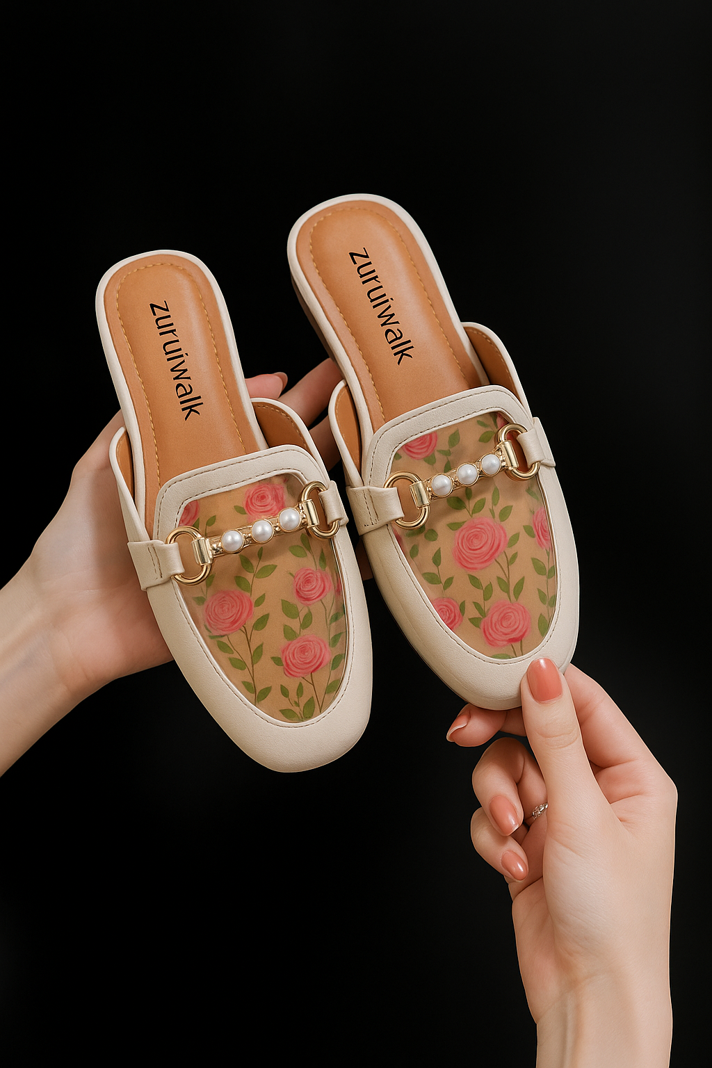 Step into elegance with the Transparent Mules by ZurujWalk – a perfect fusion of style and sophistication. These cream-toned mules feature a transparent upper embedded with a delicate floral print in soft pinks, oranges, and warm earthy tones, enhanced with a golden chain and pearl detailing. The flat sole ensures all-day comfort, while the airy design adds a refreshing twist to your everyday or semi-formal outfits. Ideal for brunch dates, office wear, or casual outings, these mules redefine summer chic.