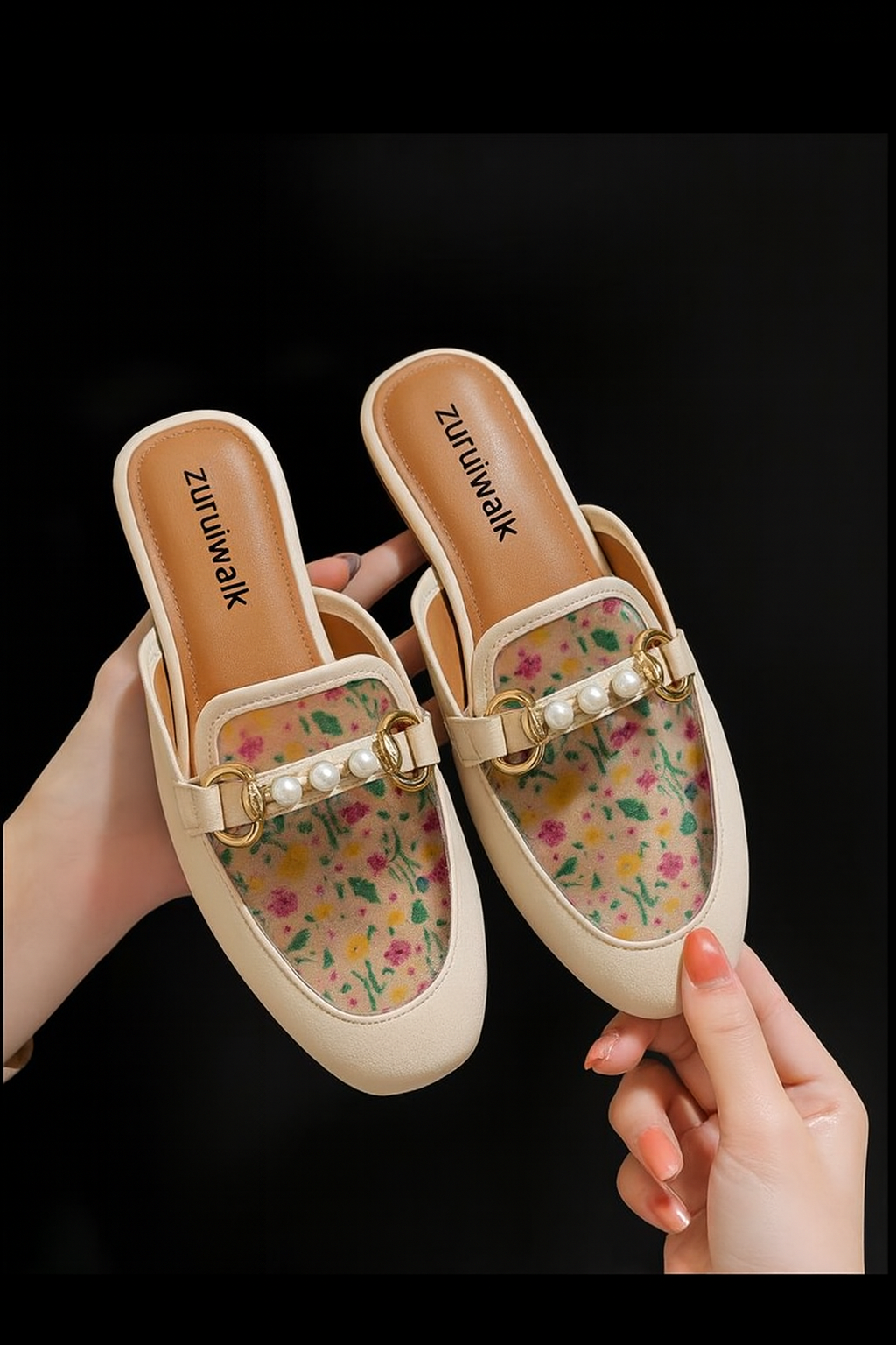 Step into elegance with the Transparent Mules by ZurujWalk – a perfect fusion of style and sophistication. These cream-toned mules feature a transparent upper embedded with a delicate floral print in soft pinks, oranges, and warm earthy tones, enhanced with a golden chain and pearl detailing. The flat sole ensures all-day comfort, while the airy design adds a refreshing twist to your everyday or semi-formal outfits. Ideal for brunch dates, office wear, or casual outings, these mules redefine summer chic.