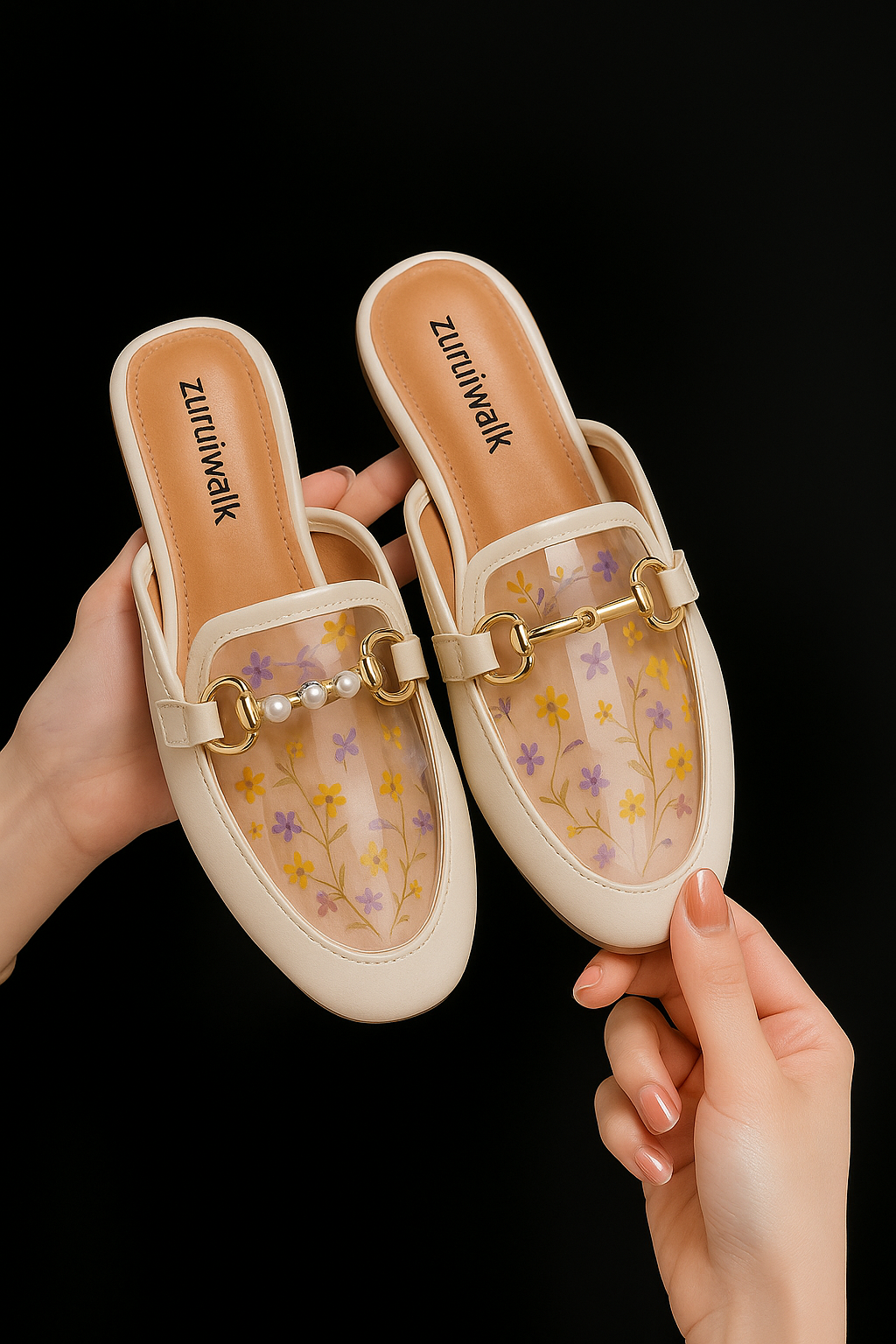 Step into elegance with the Transparent Mules by ZurujWalk – a perfect fusion of style and sophistication. These cream-toned mules feature a transparent upper embedded with a delicate floral print in soft pinks, oranges, and warm earthy tones, enhanced with a golden chain and pearl detailing. The flat sole ensures all-day comfort, while the airy design adds a refreshing twist to your everyday or semi-formal outfits. Ideal for brunch dates, office wear, or casual outings, these mules redefine summer chic.