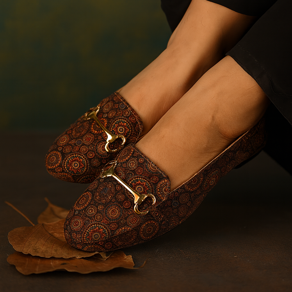 Step into sophistication with our Mandala Muse Flats – a captivating blend of comfort and cultural charm. These slip-on flats feature a deep, rich base adorned with intricate mandala-inspired motifs in earthy tones, giving them a refined ethnic elegance.