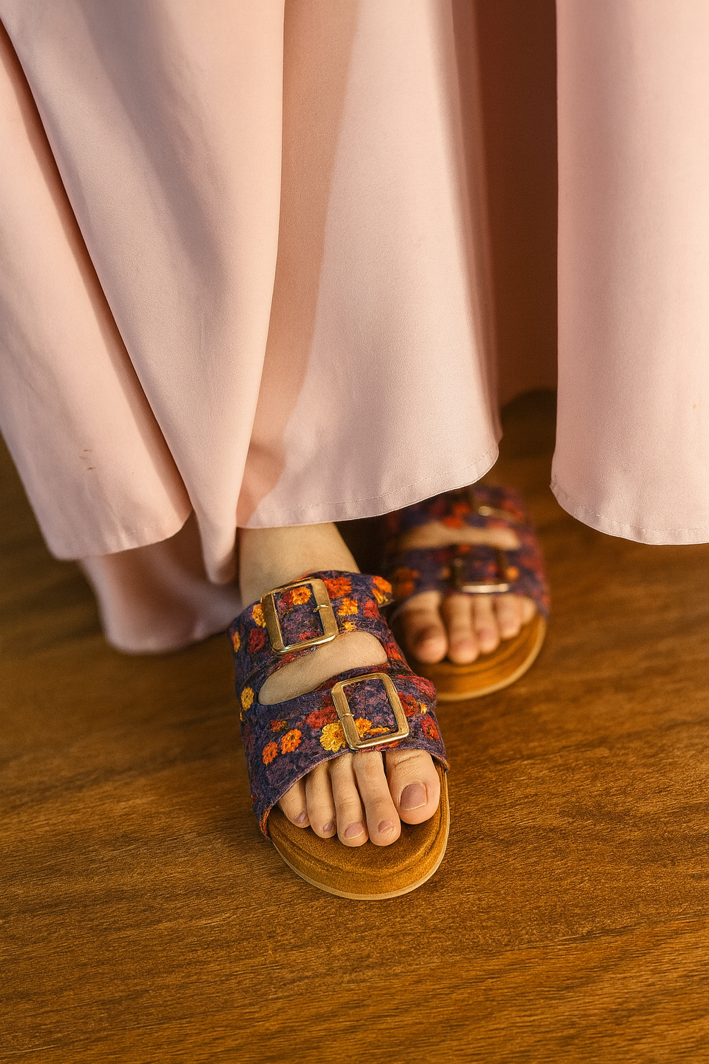 Step into comfort and confidence with Midnight Bloom Slip-Ons by Zurujwalk. Designed with a dark navy base and vibrant floral prints, these double-buckle slides are a perfect fusion of bold style and everyday ease. Featuring a soft cushioned sole and adjustable straps, they offer an effortlessly chic look for casual outings or at-home lounging. Ideal for fashion-forward women who love color, comfort, and cultural charm in every step.